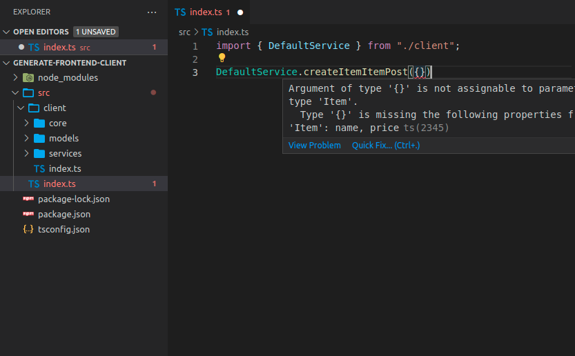 After generating the new client, you would now have clean method names, with all the autocompletion, inline errors, etc: